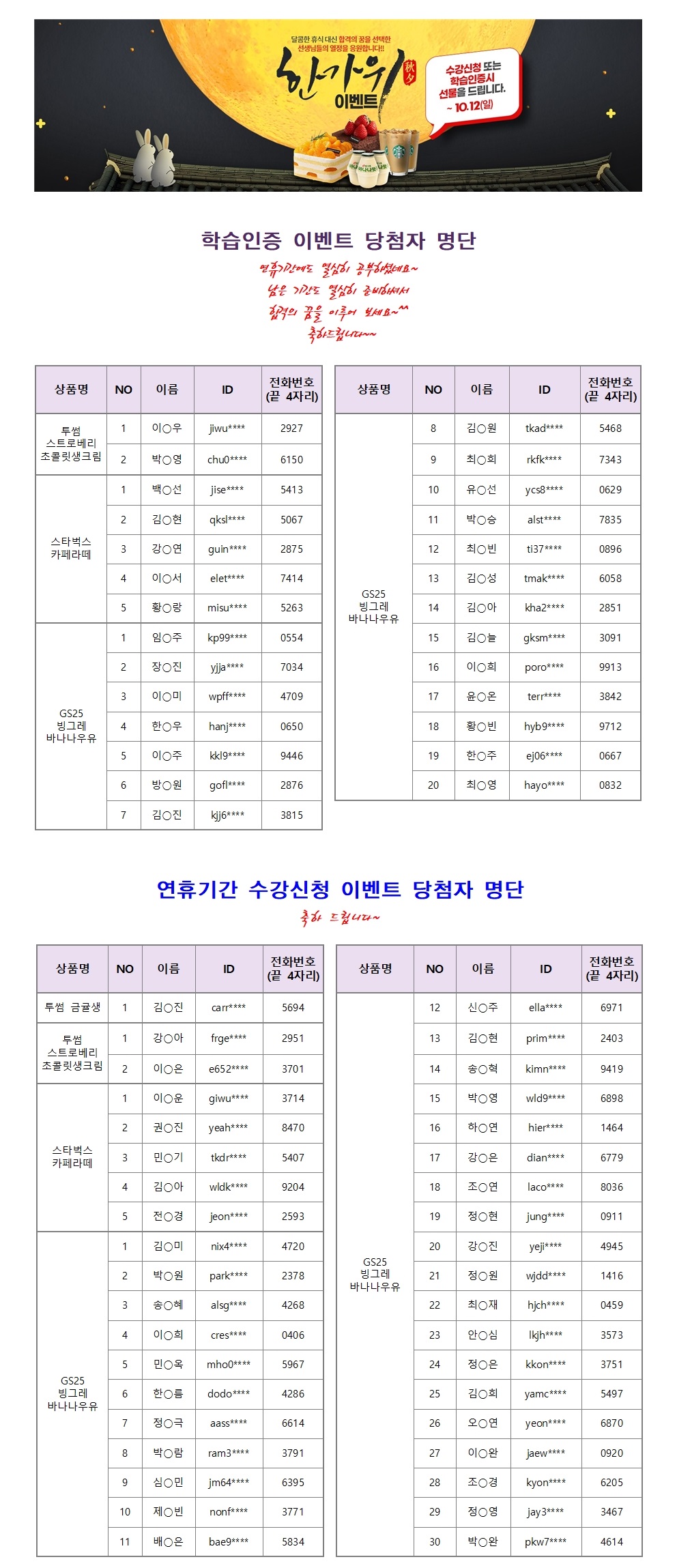 지난 추석 연휴기간, 수강신청과 학습인증 이벤트를 진행하였습니다.